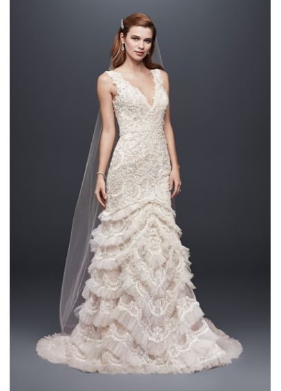 Display table with succulent wedding favors. Cascading bouquets wrapped in ribbon. Plus, we offer hair tips and jewelry pairings for each style. Delicate chantilly lace insets sewn at the plunging neckline and open back add romantic allure to this ethereal chiffon gown. An elegantly classic lace gown is finished with a sultry deep v neckline for a modern finish to an elegant style.